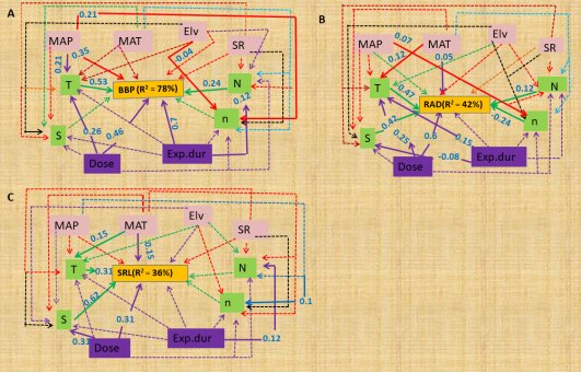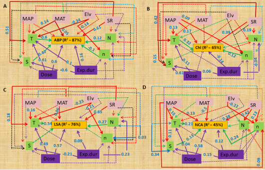 研究发现,磷素添加使树木地上部分生物量 (ABP) 增加 56%(图2),叶表面积 (LSA) 增加 12%,叶绿素 (Chl) 增加 31%,净碳同化速率 (NCA) 增加 24%,地下部分生物量 (BBP) 增加 17%,比根长 (SRL) 增加 23%;RAD 略有下降但不显著。与演替早期阶段的树木 (53%) 相比,演替后期阶段的树木 ABP 增幅最大 (58%);演替早期及后期阶段的树木NCA 和 Chl 对磷素添加都表现为正响应,且在演替后期阶段增幅最大。此外,磷素添加对树木光合特性和生产力的影响随纬度增大而减弱,地上生物量生产力 (ABP)的响应随地理位置和海拔变化最显著(图3)。磷素添加(实验持续时间及添加剂量)、年均降雨量、年均温、太阳辐射及其他实验因子的交互作用共同影响树木群落结构及树木个体发育,从而影响树木光合性状和生产力(图4、图5)。