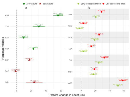 地上生物量生产力 (ABP)、叶绿素含量 (Chl)、叶表面积 (LSA)、净碳同化速率 (NCA)、地下生物量生产力 (BBP)、比根长 (SRL) 和根平均直径 (RAD)。每个响应变量括号中的数字 (n) 表示用于荟萃分析的观测值数量。x 轴表示每个性状效应大小的平均百分比,ns表示不显著、* p < 0.05、** p < 0.01 和 *** p < 0.001。