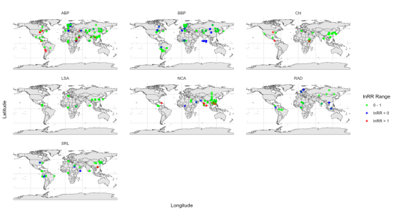 树木生产力因子包括地上生物量生产力(ABP)和地下生物量生产力(BBP)。树木生理和形态性状包括叶表面积(LSA)、叶绿素含量(Chl)、净碳同化速率(NCA)、根平均直径(RAD)和比根长(SRL)。不同颜色代表效应量(lnRR)的范围,表明对磷素添加的响应强度和方向。正值表示对磷素添加的正响应,负值表示负响应。