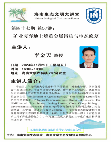 2024年11月29日下午,海南生态文明大讲堂第四十七期第57讲在农科楼207会议室成功举办。本次讲座由华南师范大学生命科学学院李金天教授主讲,yl6776永利集团副院长(挂职)刘文杰教授主持。