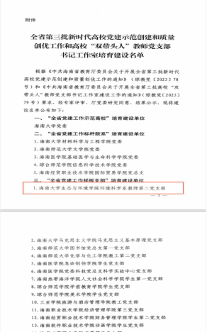 10月18日,海南省教育厅遴选产生了一批全省党建工作示范高校、党建工作标杆院系、党建工作样板支部和“双带头人”教师党支部书记工作室。我院环境科学系教师第二党支部授予“全省党建工作样板支部”荣誉称号。